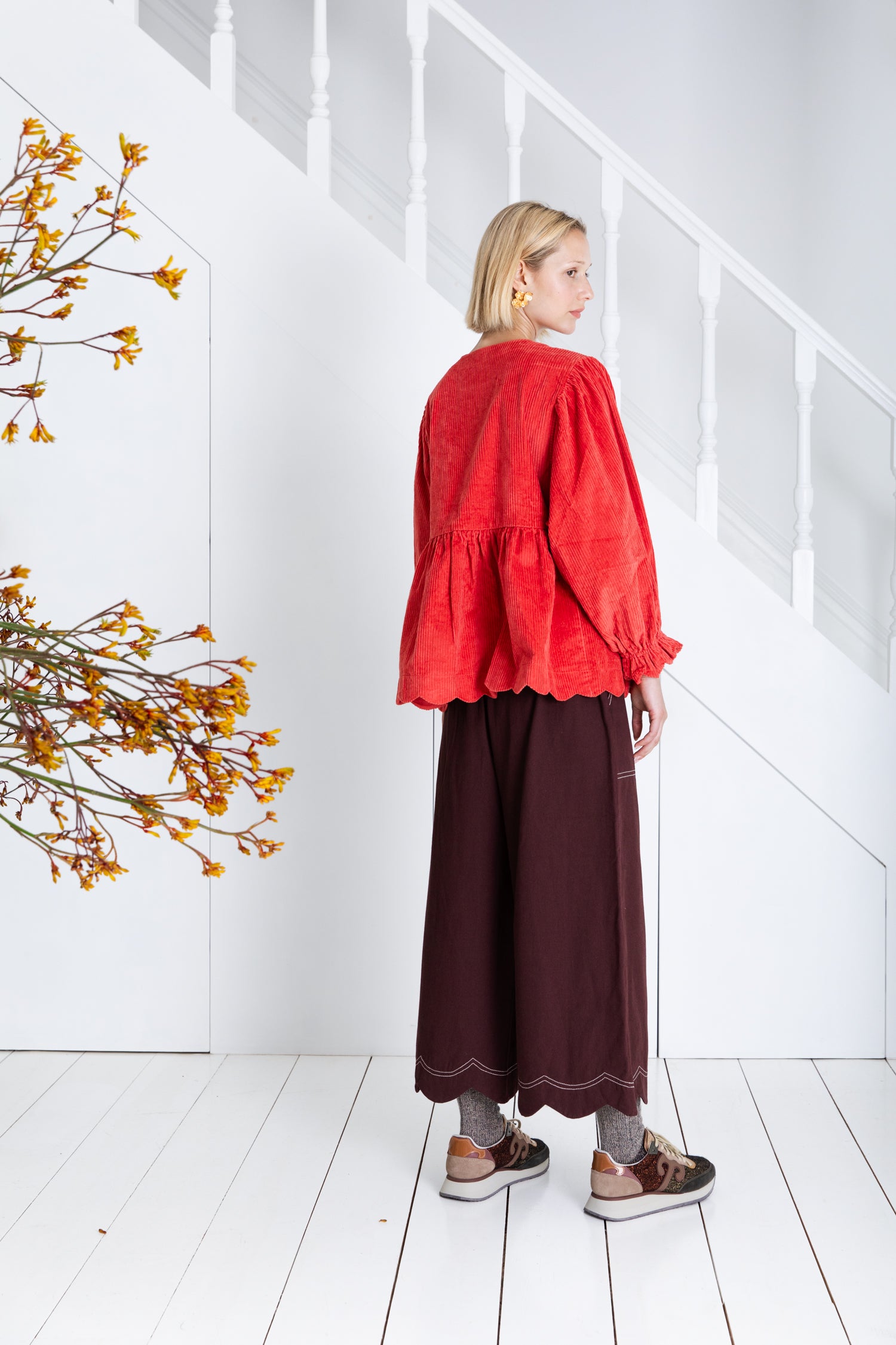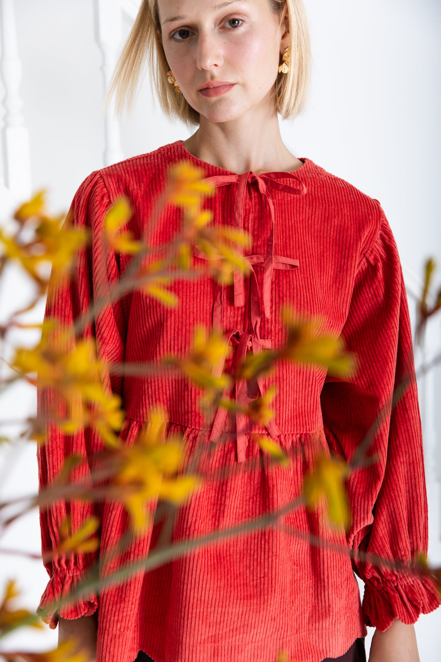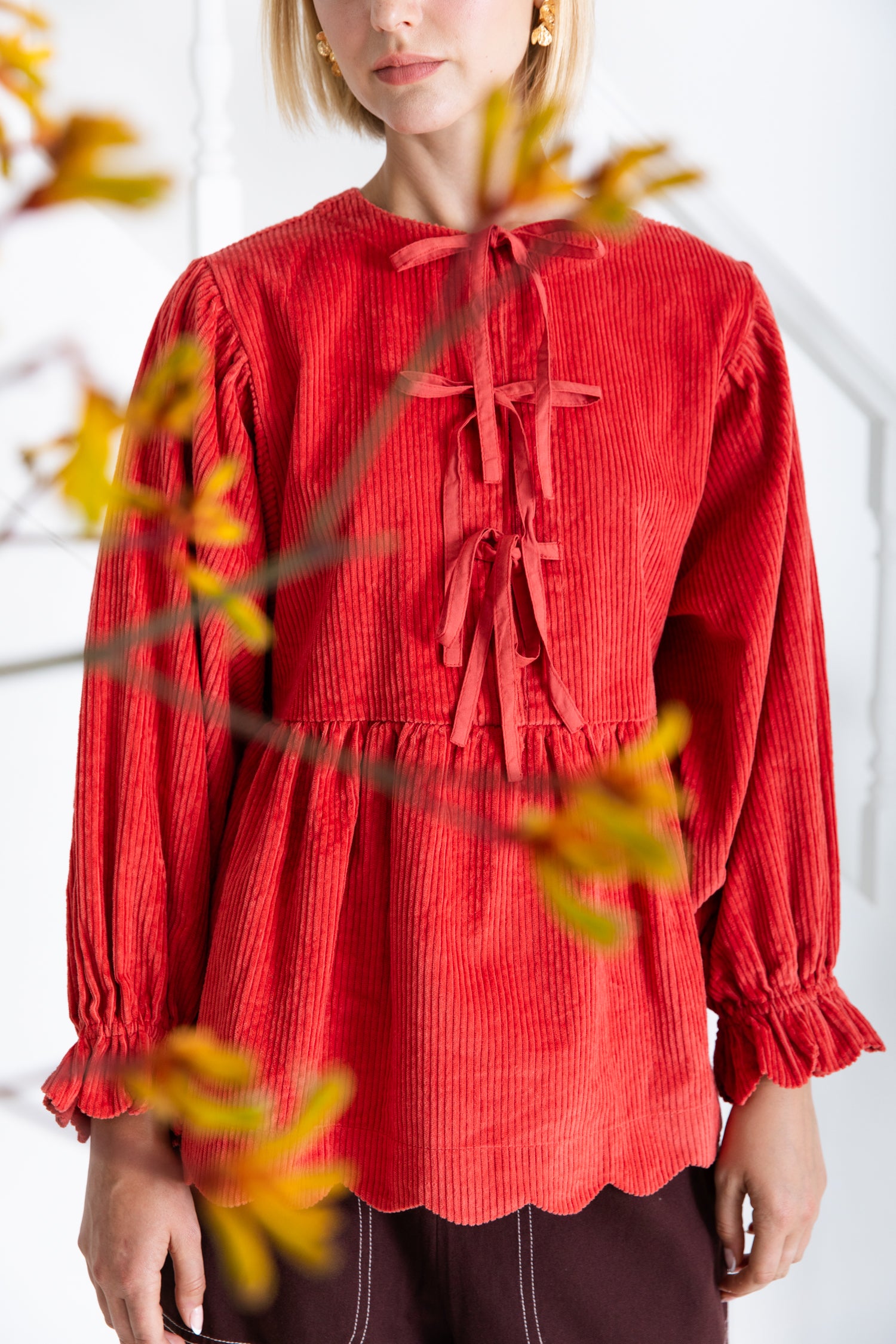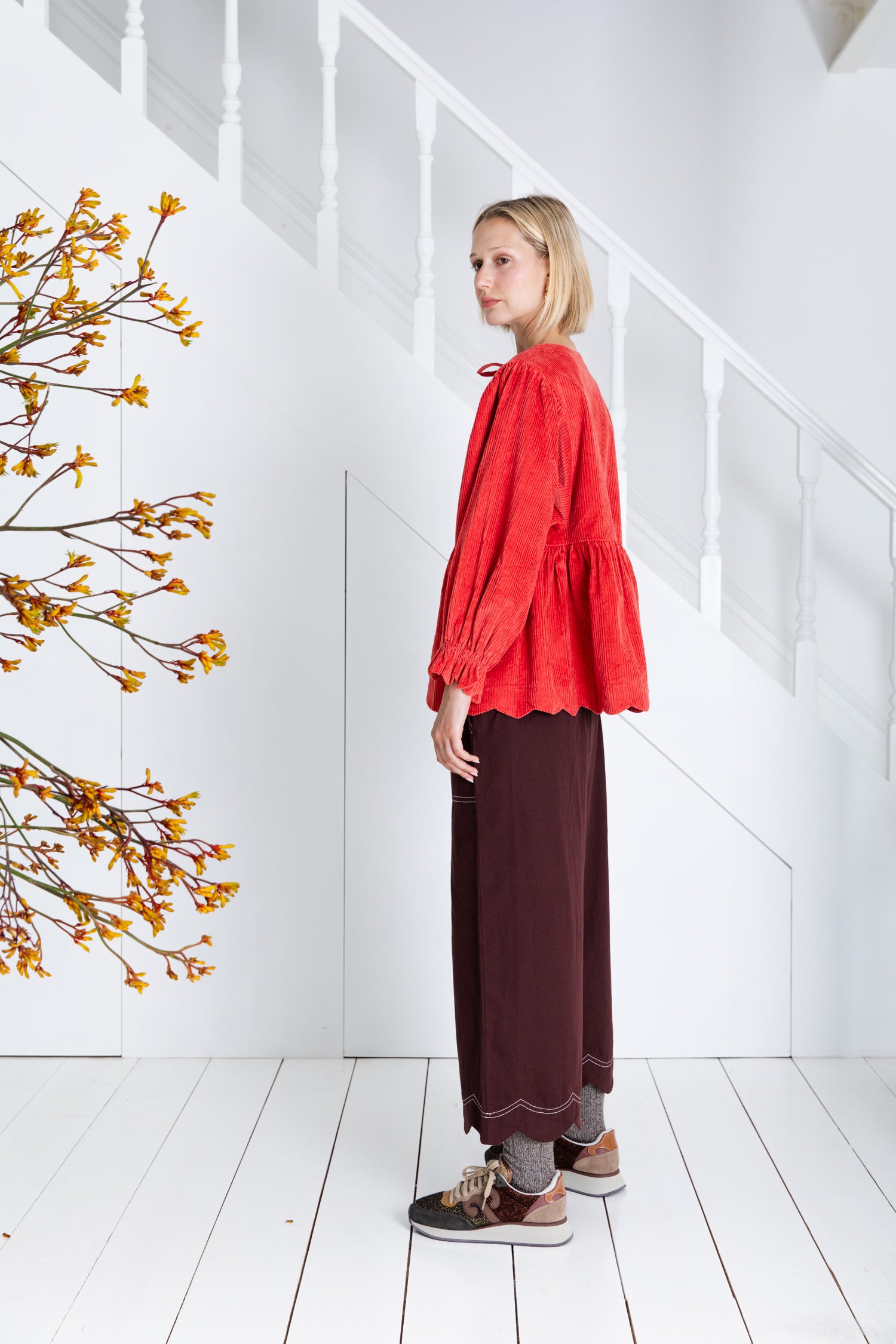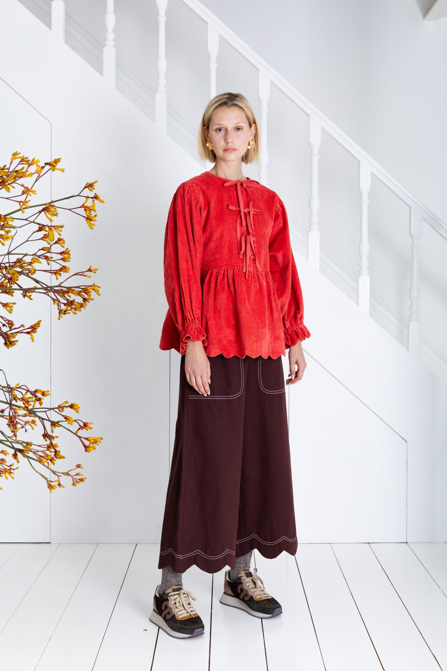An empire-line top in organic cotton jumbo-cord, with pretty bow ties on the front + a scoop neckline. The sleeves are voluminous with gathered shoulders, a low armhole with elasticated cuffs with a feminine scallop edge. The empire waist has gentle gathers with a loose flattering shape + a scalloped hem that looks great over just jeans or a casual trousers. We love this paired with the chocolate Aide trouser for a double scallop hit.