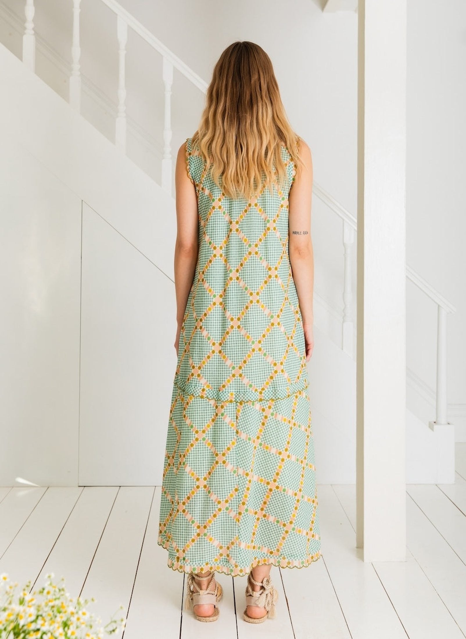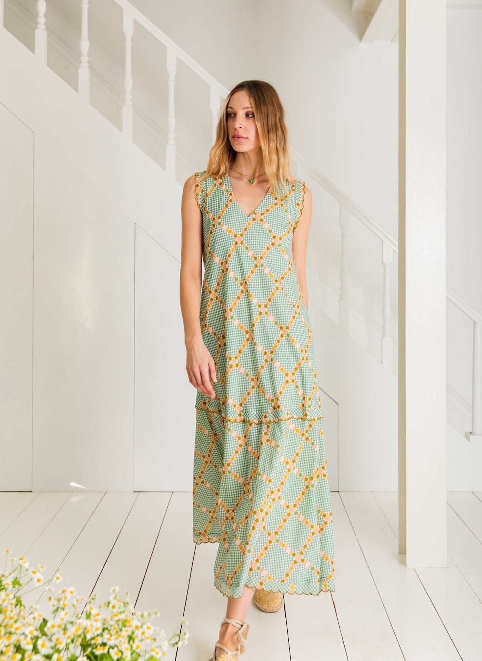The Attie Dress in Sea Mist by Bonté will be the perfect addition to your new season wardrobe. This stunning dress features a bold green Aztec pattern, creating a unique and eye-catching look. The dress is loose fitting with frilled tiers and thick frilled sleeves to create a flowing silhouette.