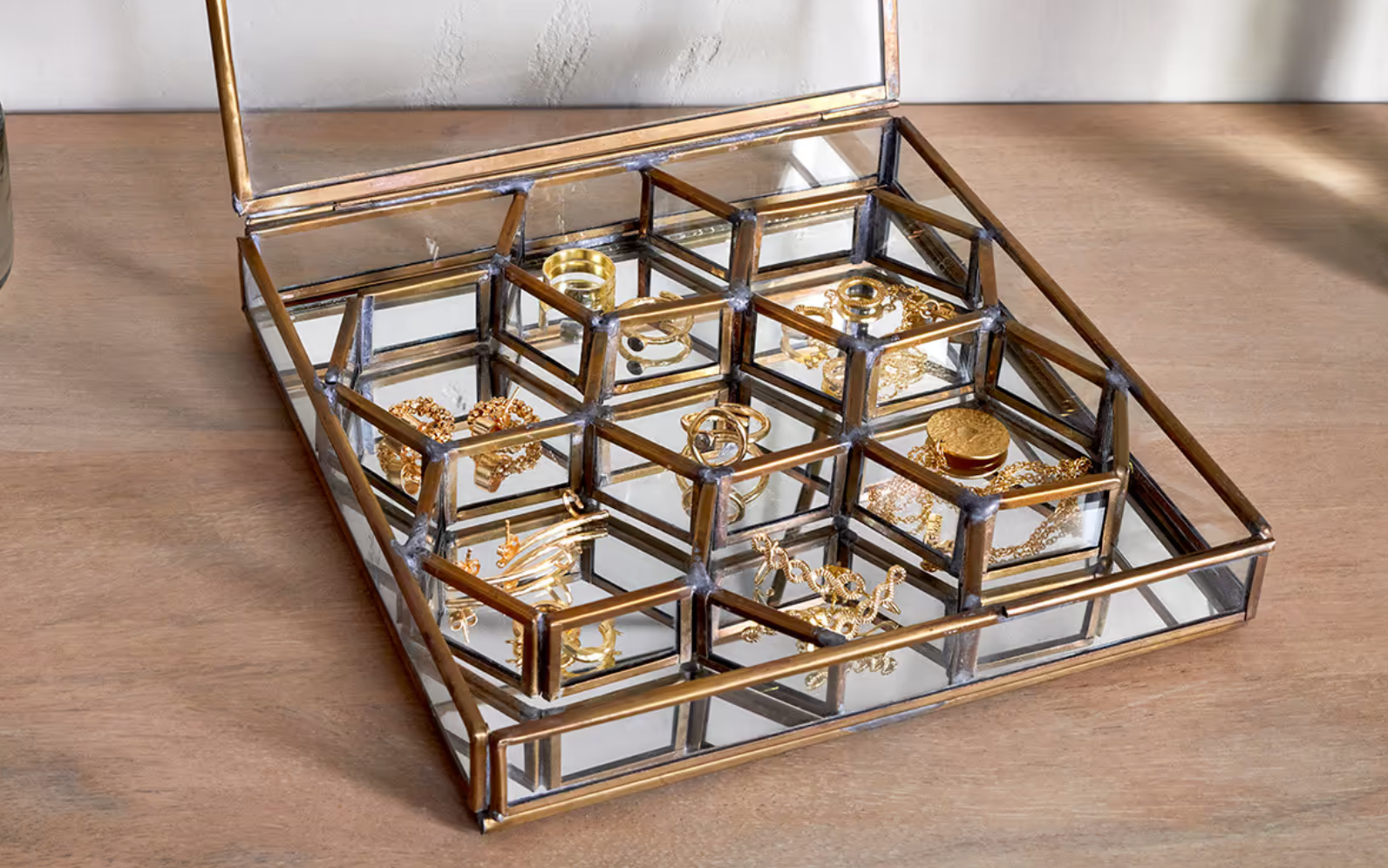 Bequai Honeucomb Box is beautifully finished in hand soldered brass with a mirror base. This gorgeous piece also has an attractive and practical honeycomb design, ideal for storing jewellery, cufflinks and other small items.