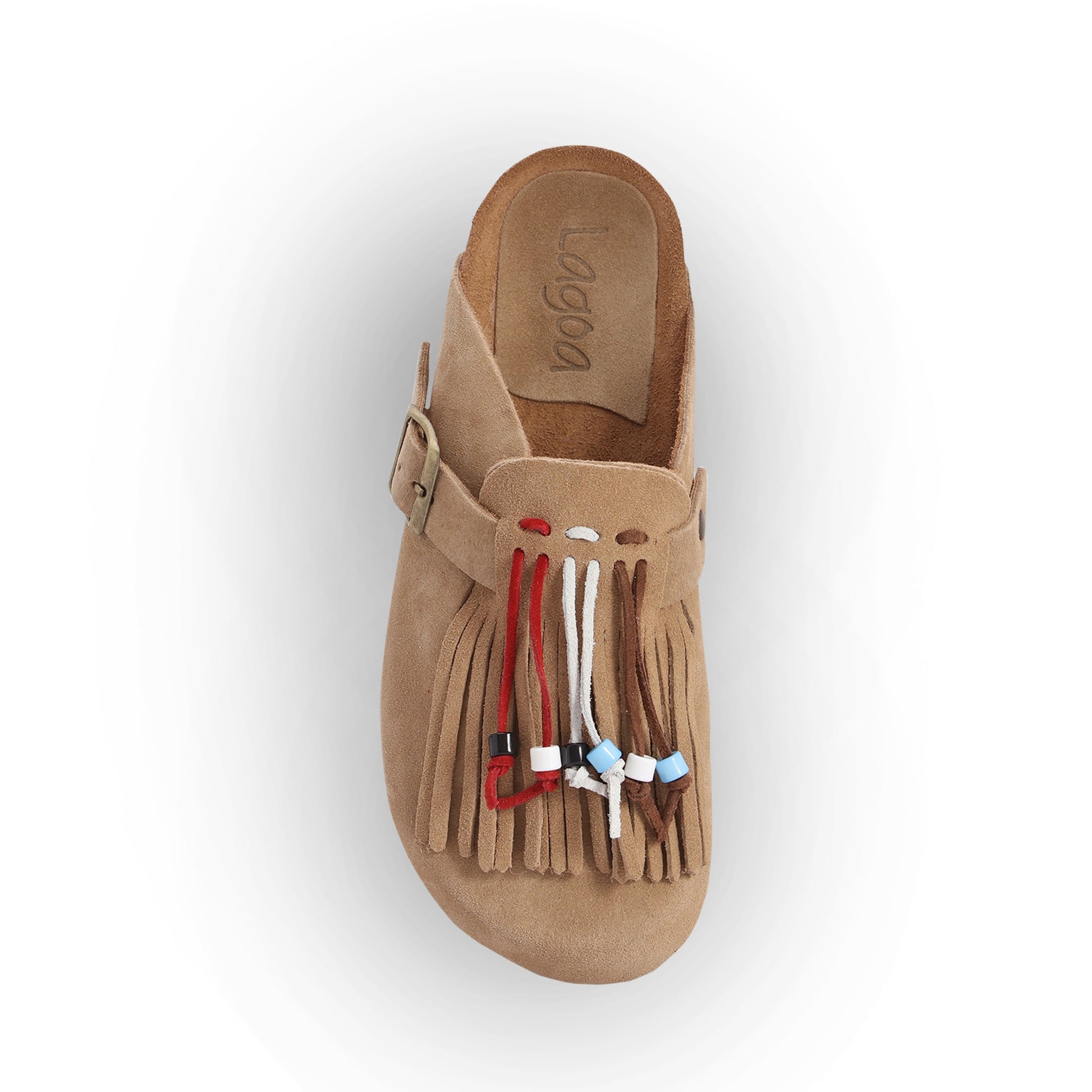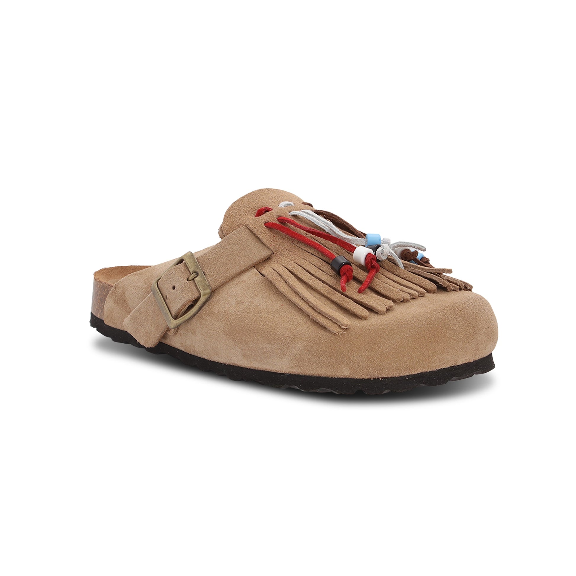 Sabot with anatomic sole. Upper and lining in arena calf leather. The fringe is made of calfskin with coloured beads, and is removable! Lightweight tread in Eva.