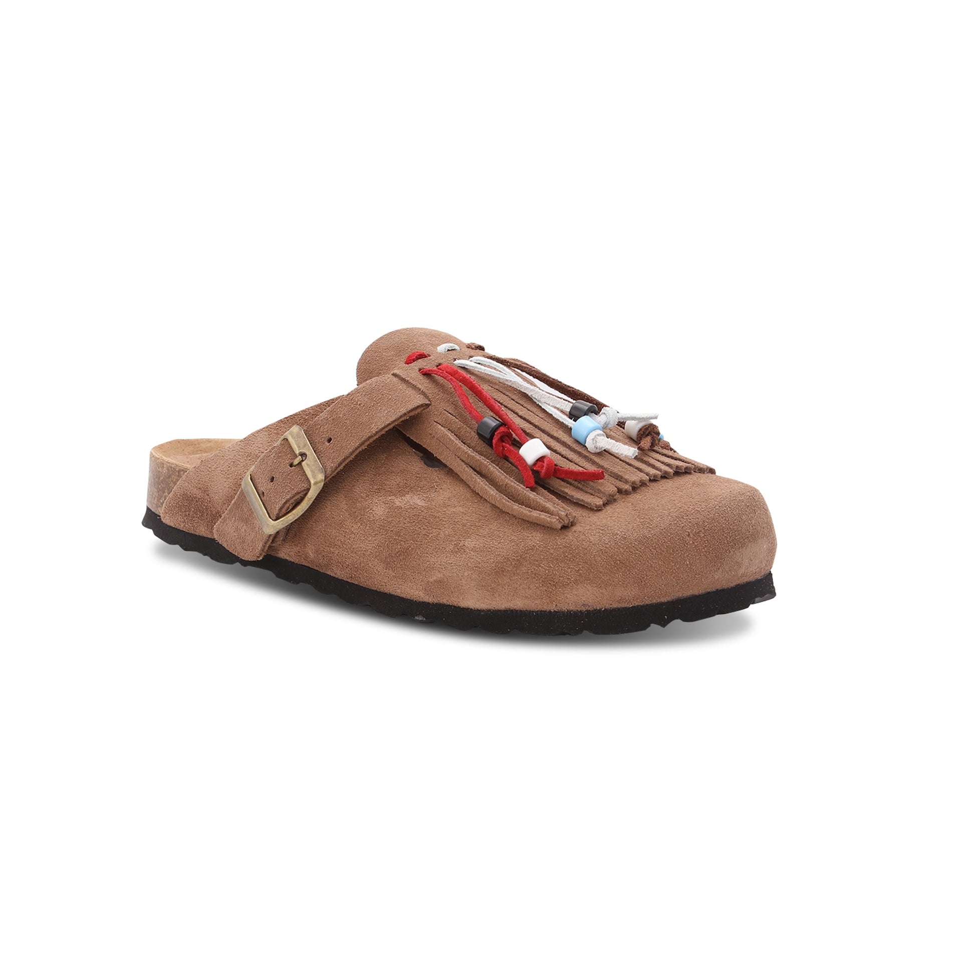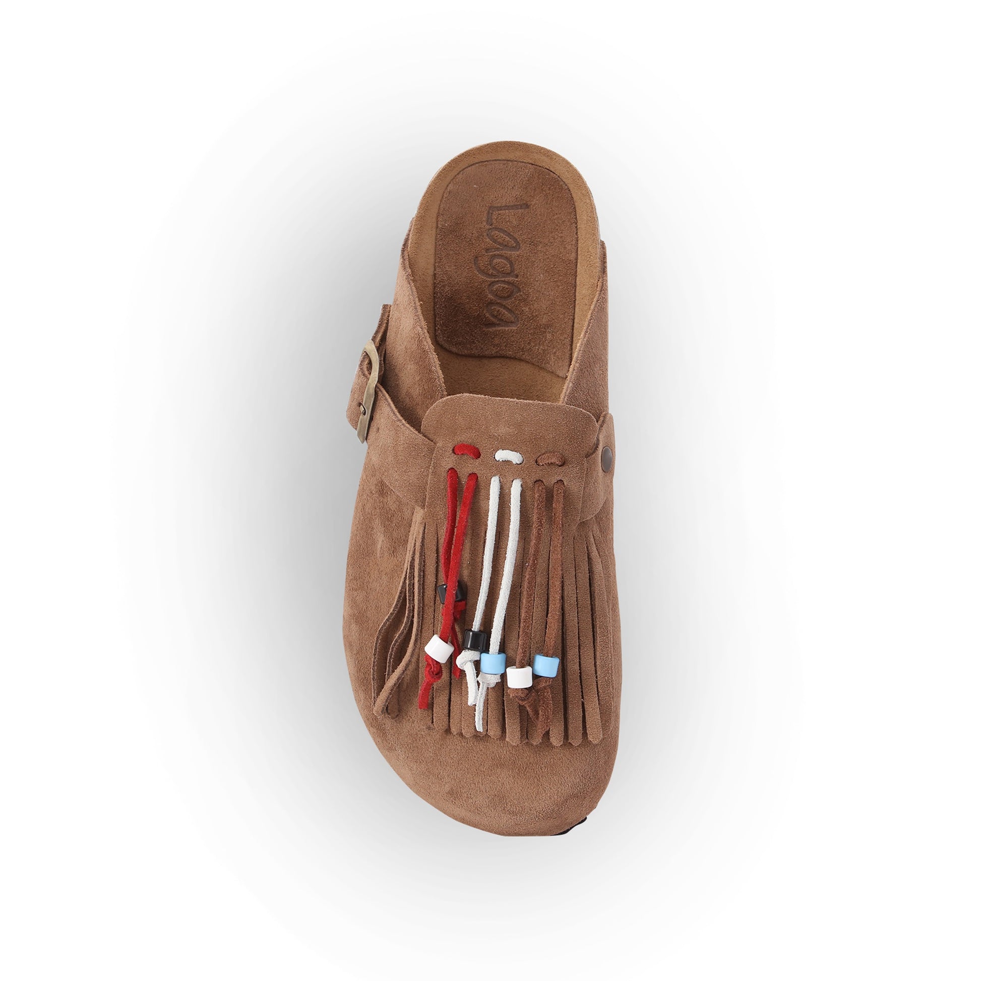 Sabot with anatomic sole. Upper and lining in visone calf leather. The fringe is made of calfskin with coloured beads, and is removable! Lightweight tread in Eva.