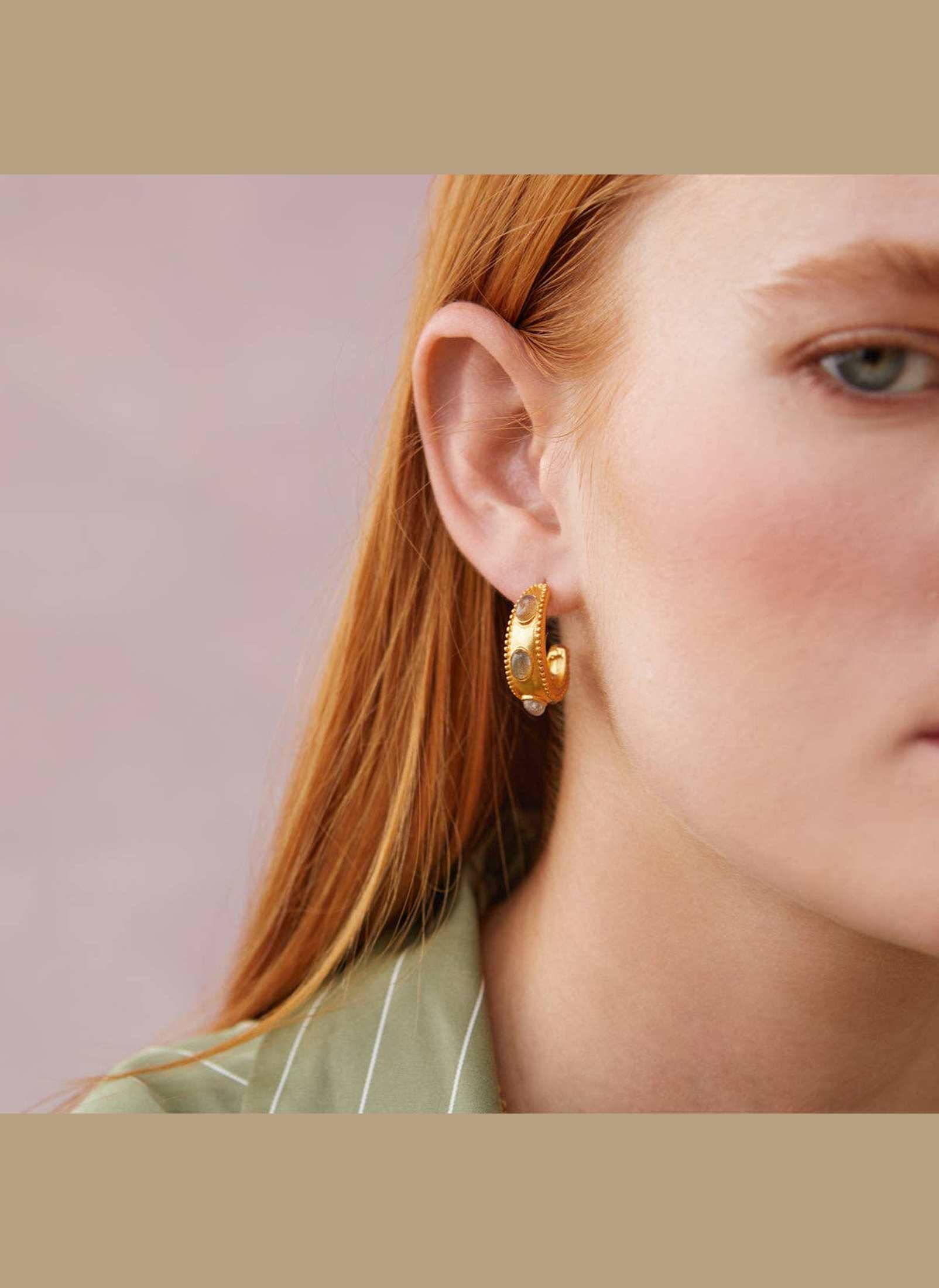 These Daphne Hoop Earrings feature set, textured labradorite gemstones. They are versatile for day wear or more formal wear in the evening.