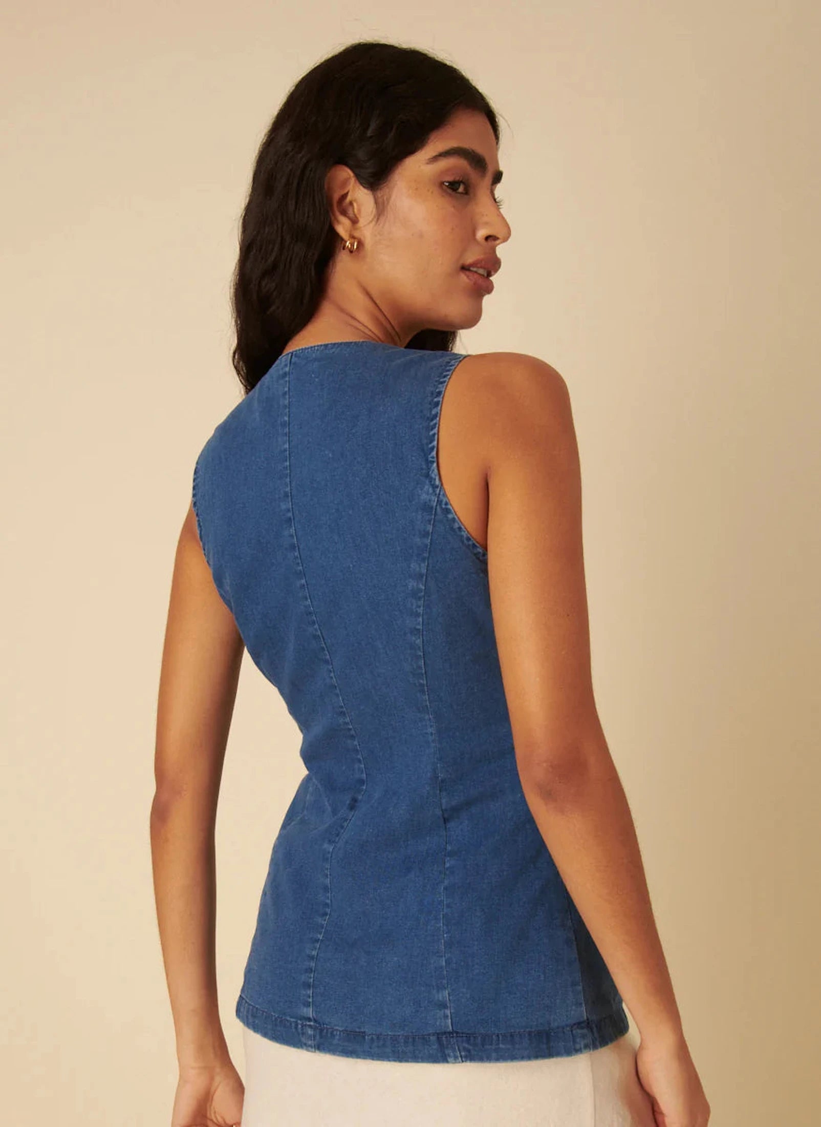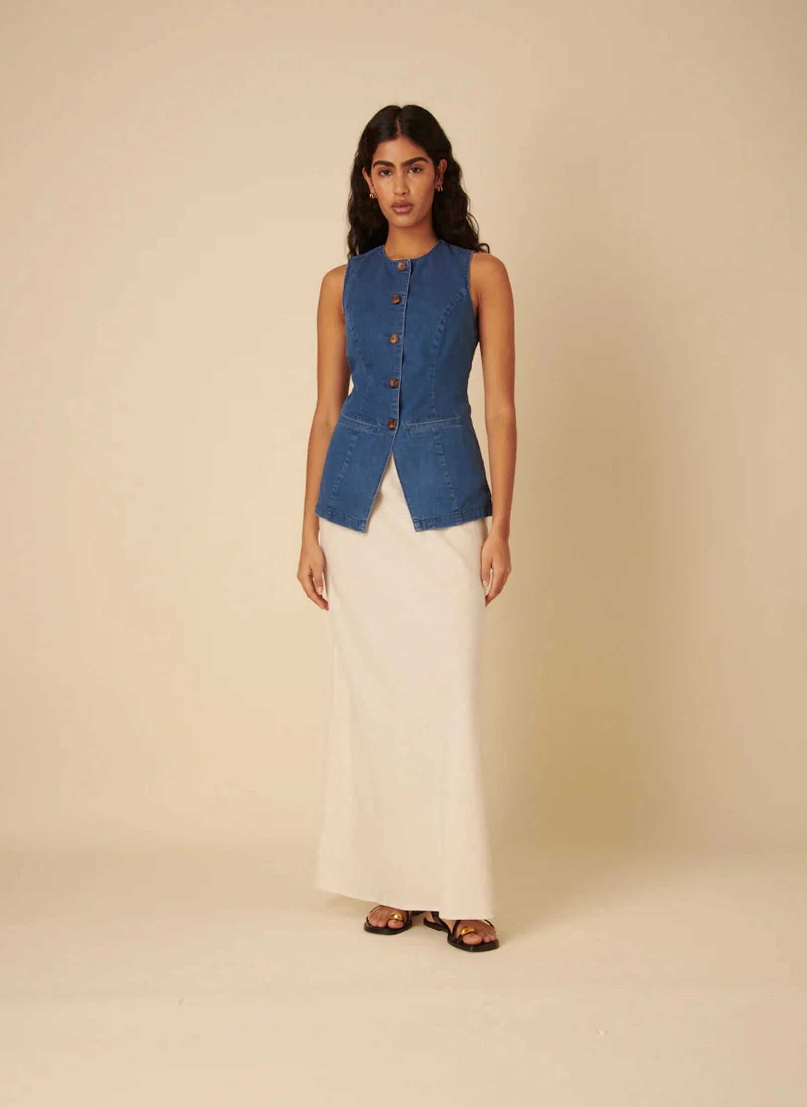 A timeless style you’ll wear on repeat. Our denim waistcoat is designed with a crew neck and contrast button front. We love the tailored details and split hem. Style with a skirt and sandals this summer.
