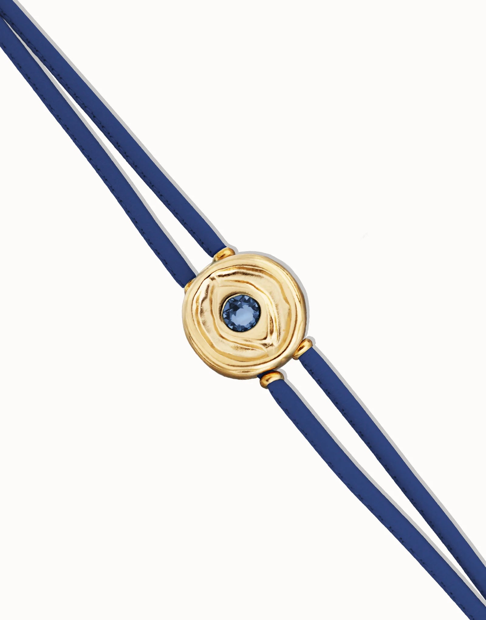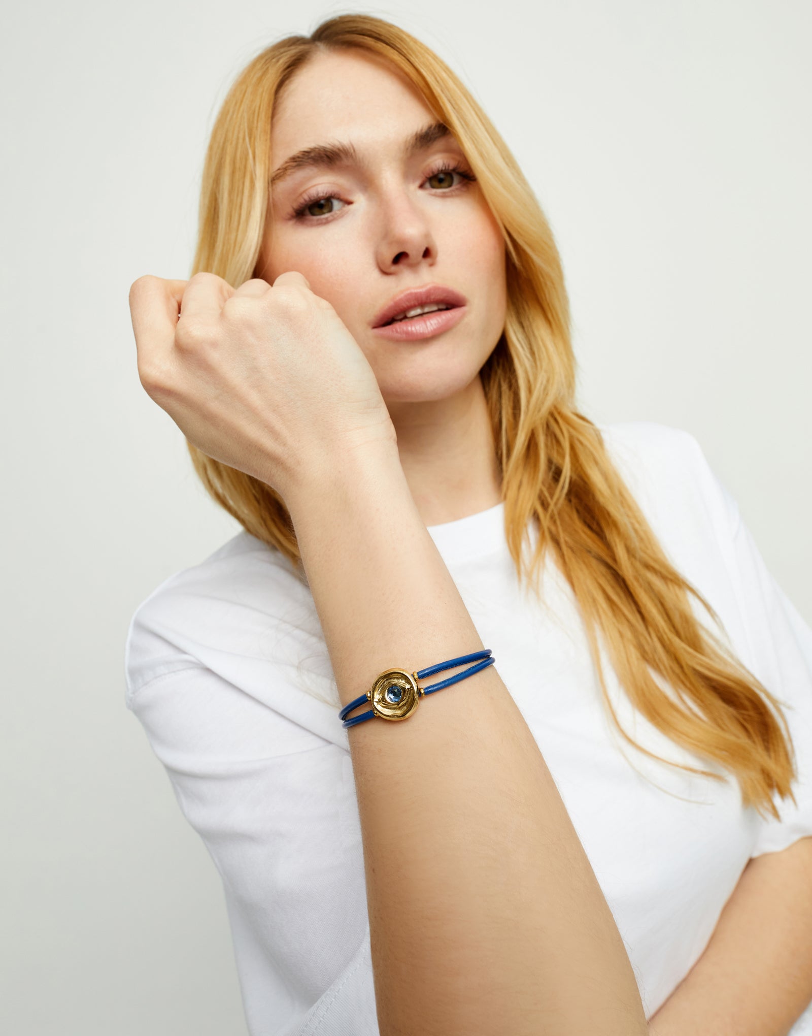 Double navy leather bracelet with gold eye. There are people who are visionary, whose intuition is their compass. Ser intuitiva takes into consideration that mystical side of us, allowing us to bring out our hidden self and show it to the world.