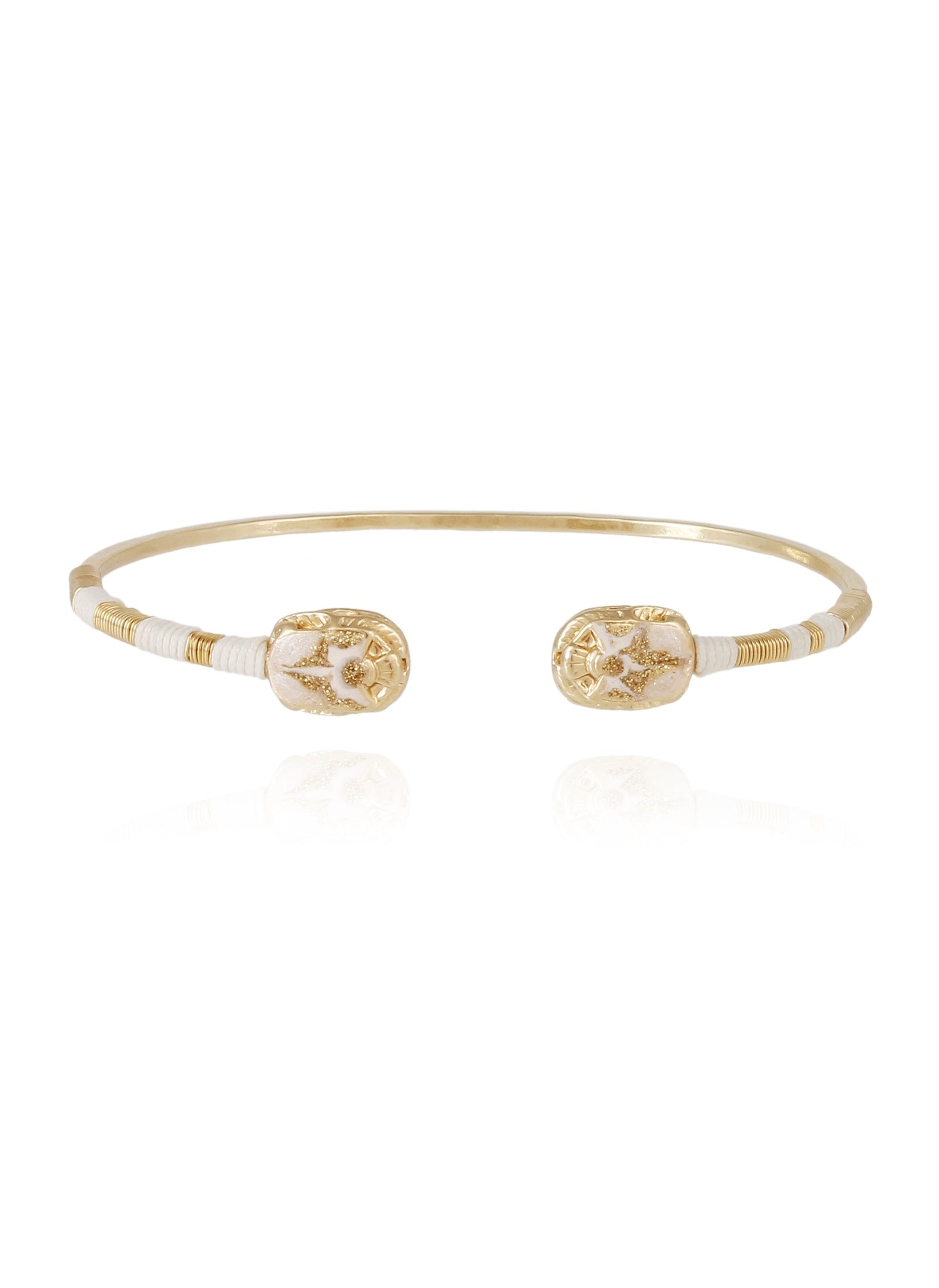 Gold plated bangle composed of two enamelled beetles in various colors.