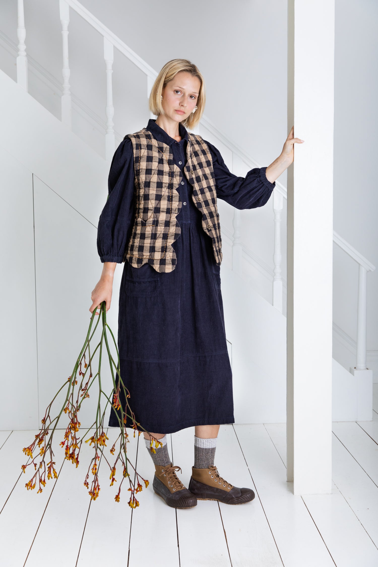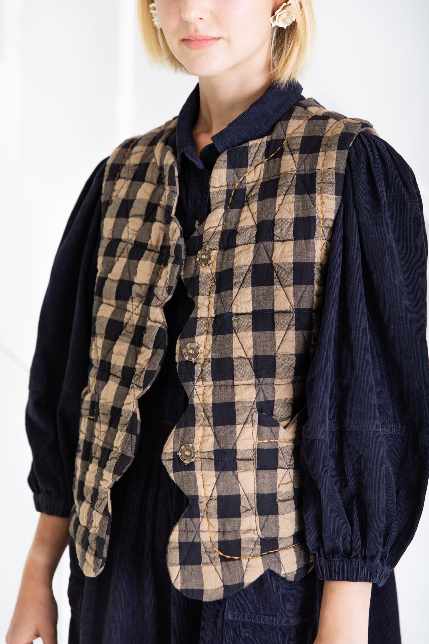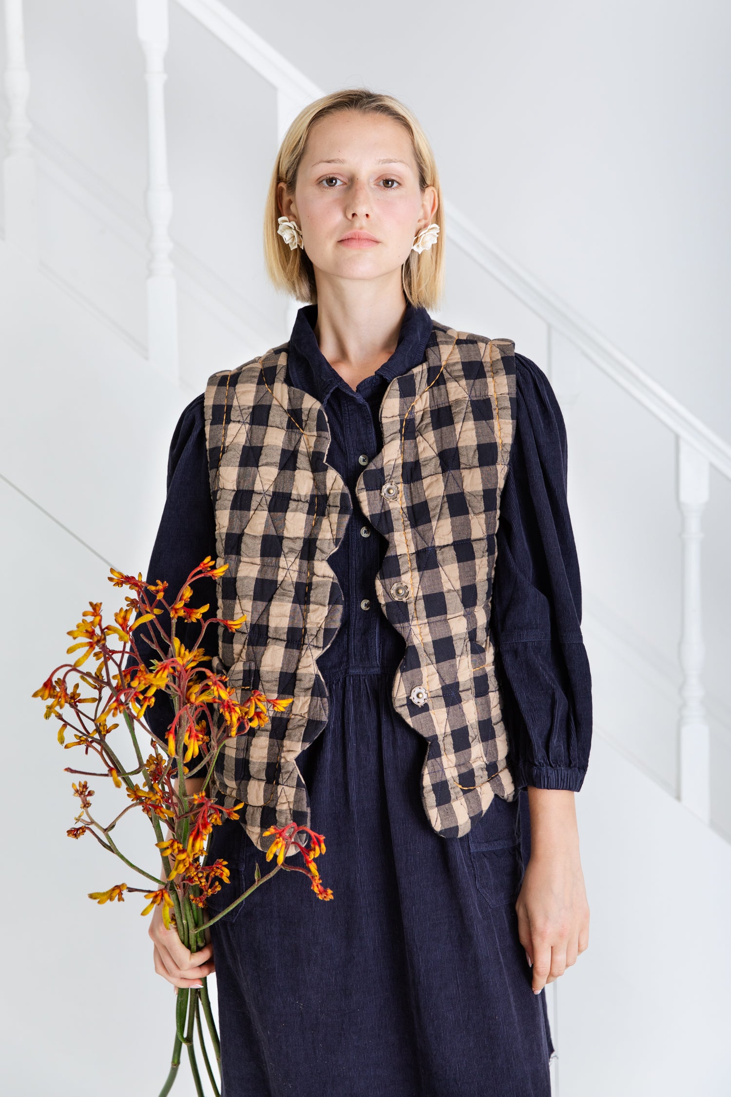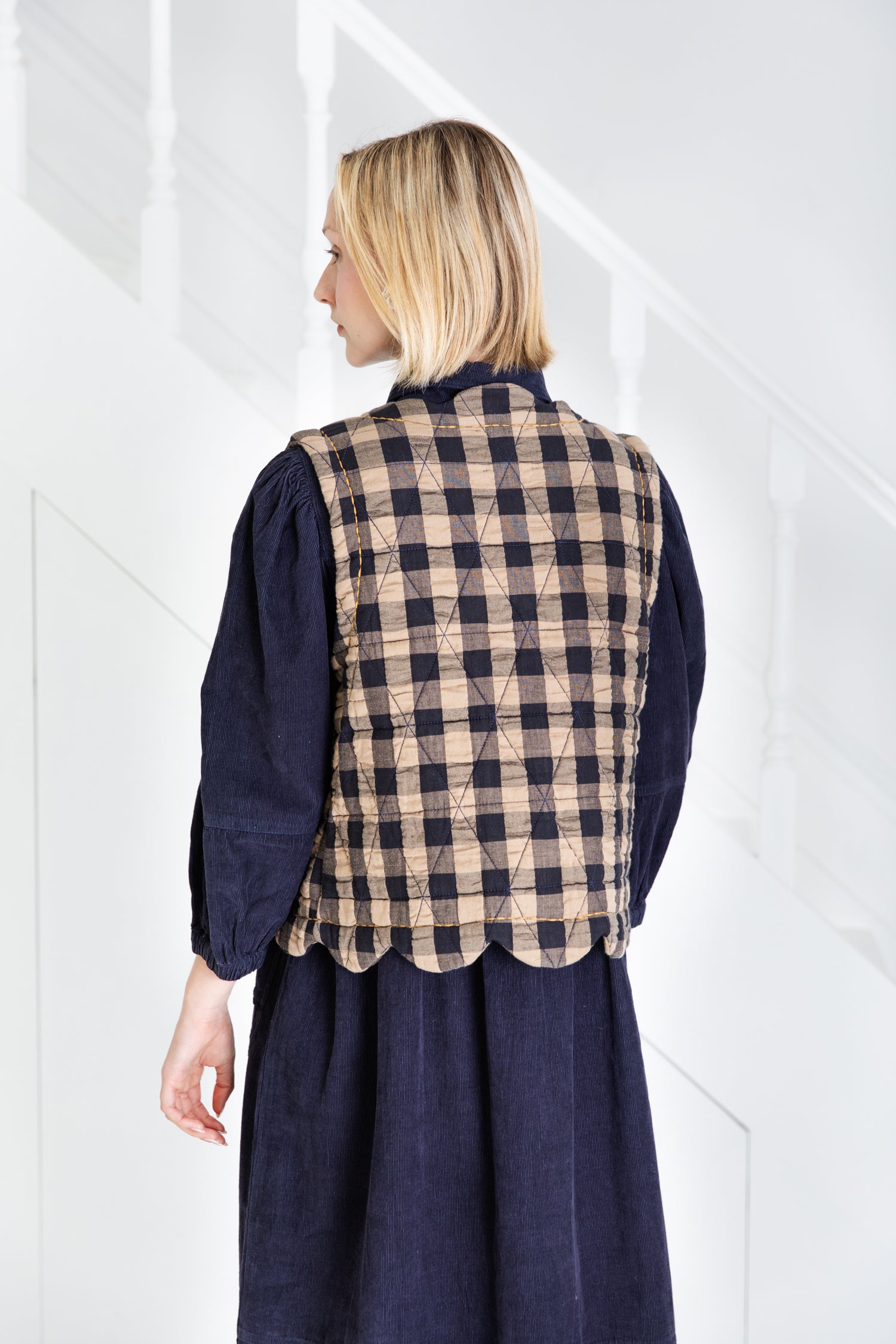 A beautiful + individual, quilted Gillet in a statement organic cotton statement check + lined in a contrast organic cotton + features a unique scallop edge detail + hand sewn press-stud fastenings. This versatile Gillet works over everything!