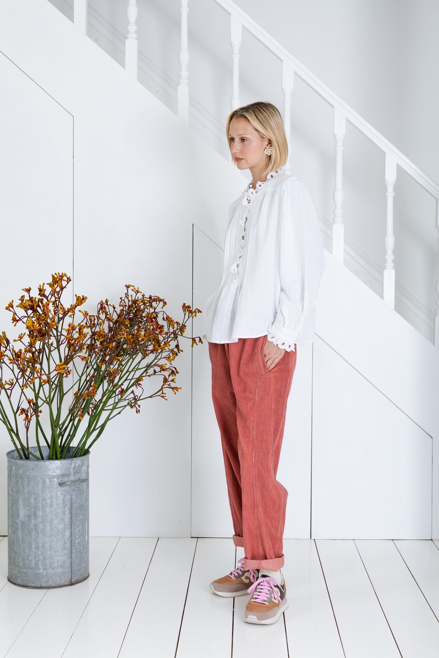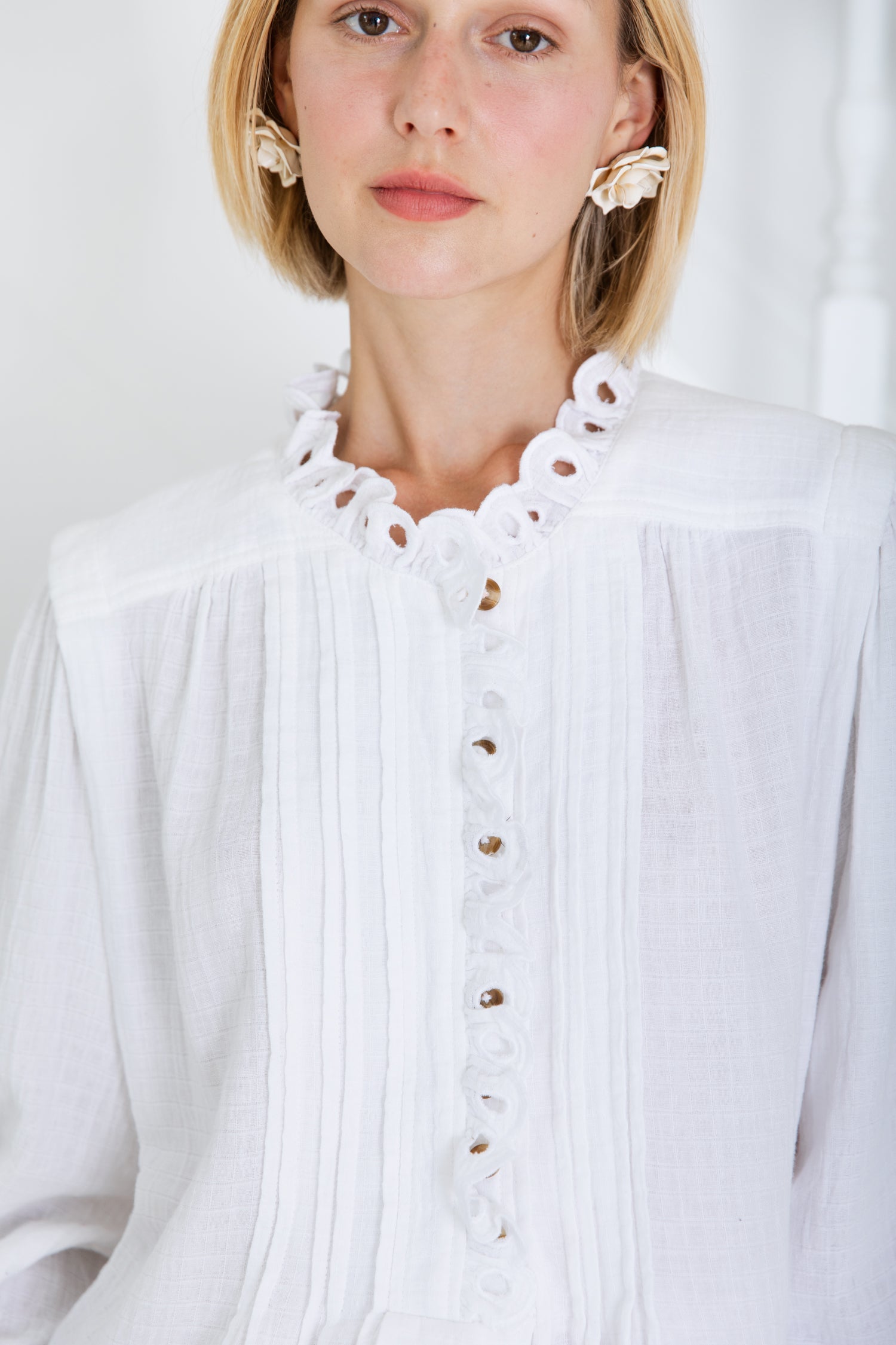 A relaxed + easy smock-style shirt in an organic cotton double-gauze, with detailed eyelet embroidery on the collar, placket and cuffs. The centre front has a concealed half-placket opening to the waist, with mock horn buttons + loop closure with, fine pleats on either side. A deep tuck features on the armhole, with gathers on the sleeve head. The hemline is longer at the back and there are side splits. The style is meant to be worn loose and slightly oversized