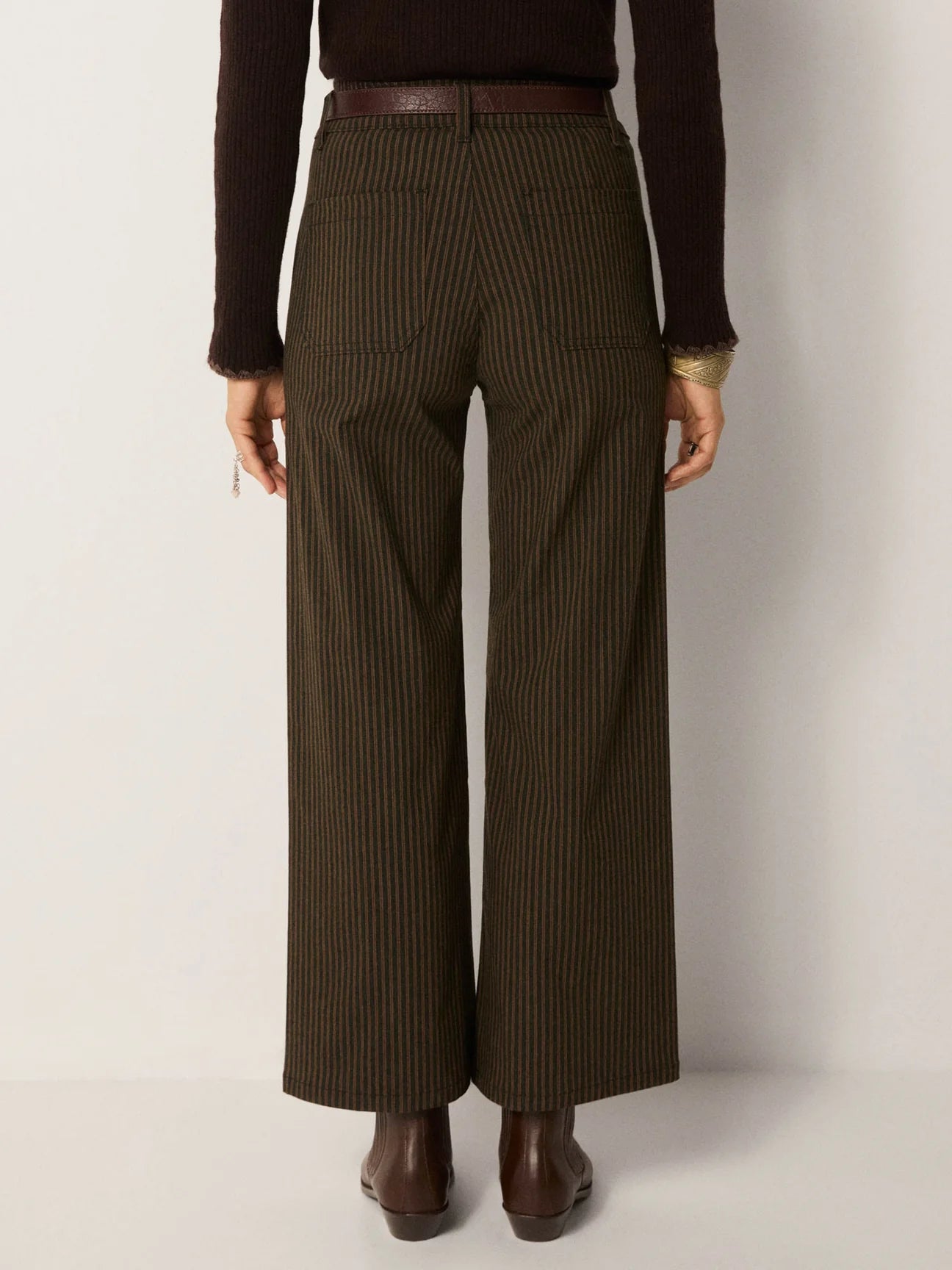 Crafted in textured viscose, this pant carries fine vertical stripes that elongate the silhouette. The olive base is enriched by tobacco hues, distinctive but quiet.