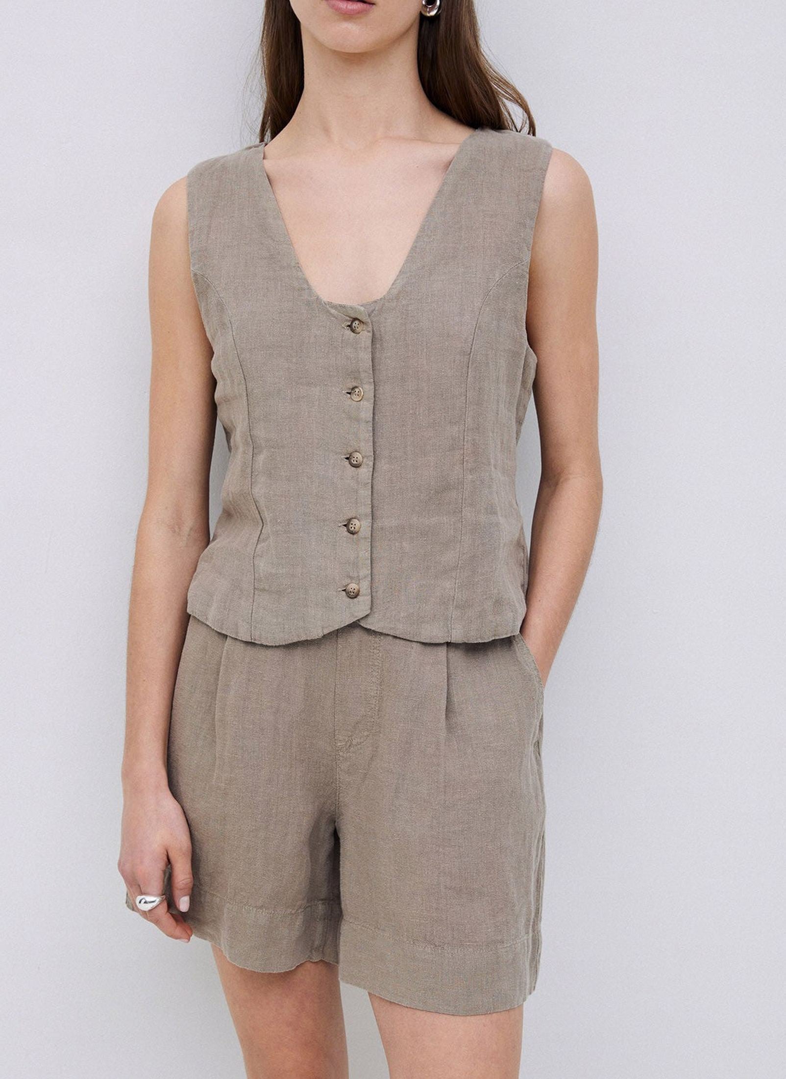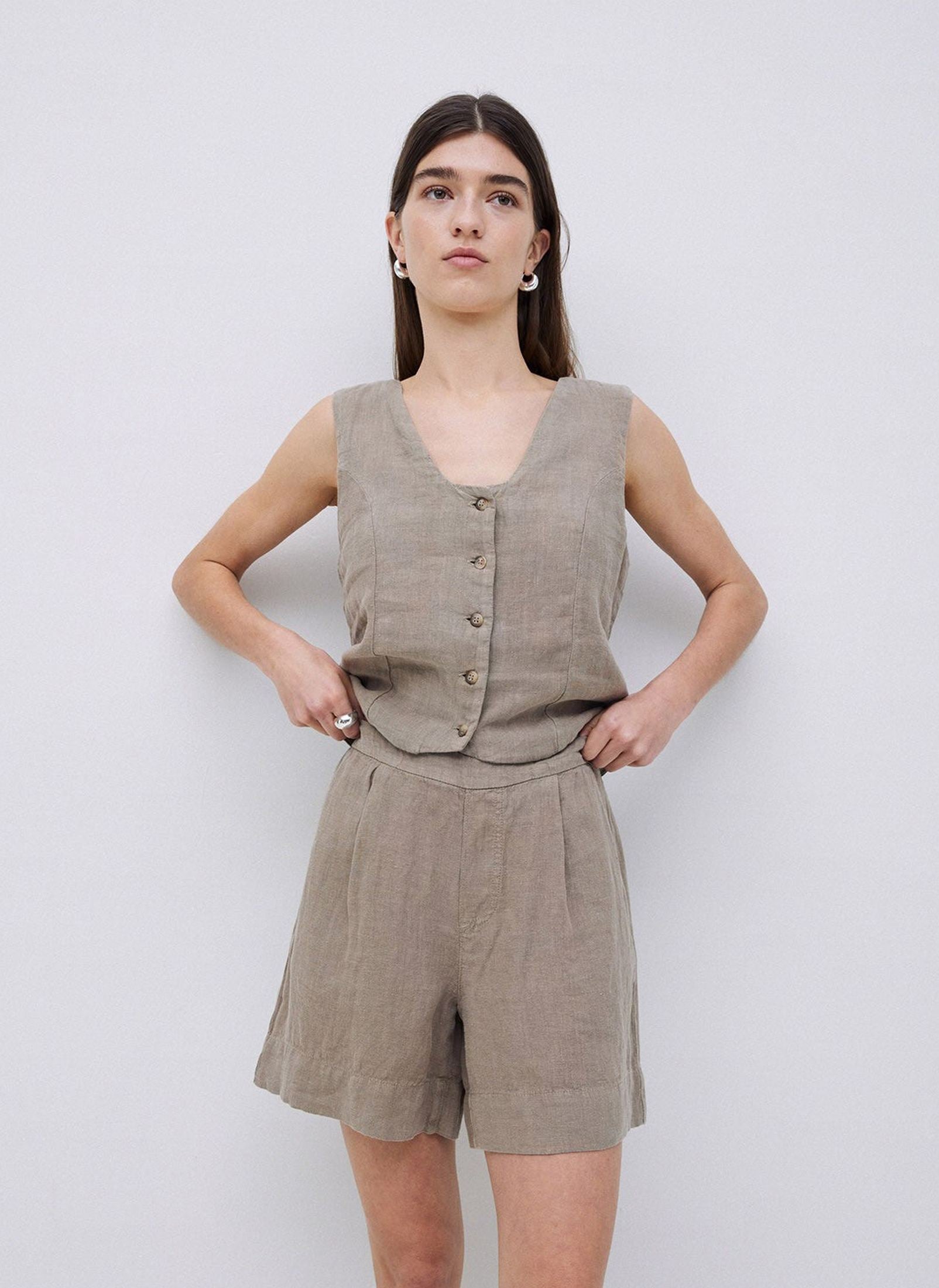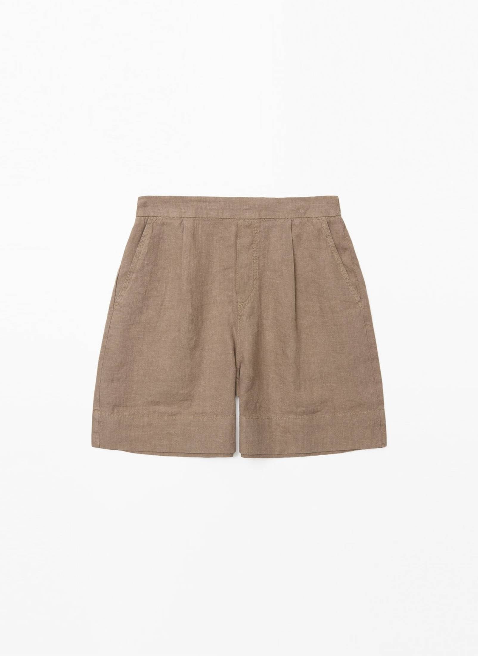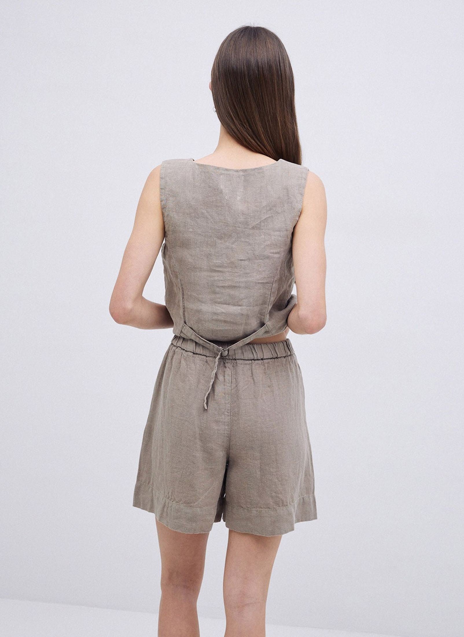 100% European Flax linen shorts. OEKO-TEX dye. Straight cut. Mid rise. No fastening. Elastic waist at the back. 2 side pockets.