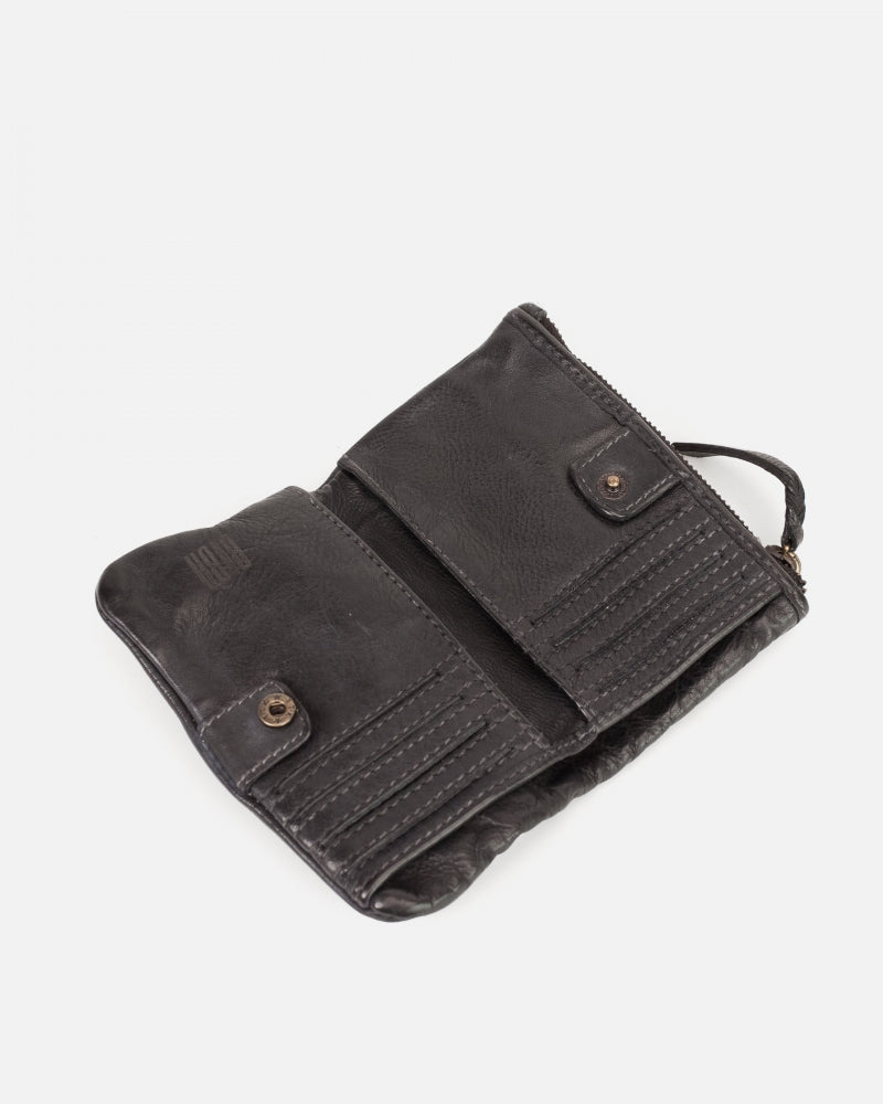Washed and vegetable-tanned calf leather wallet. Metal studs on the front. Compartments for cards, bills, and coins.