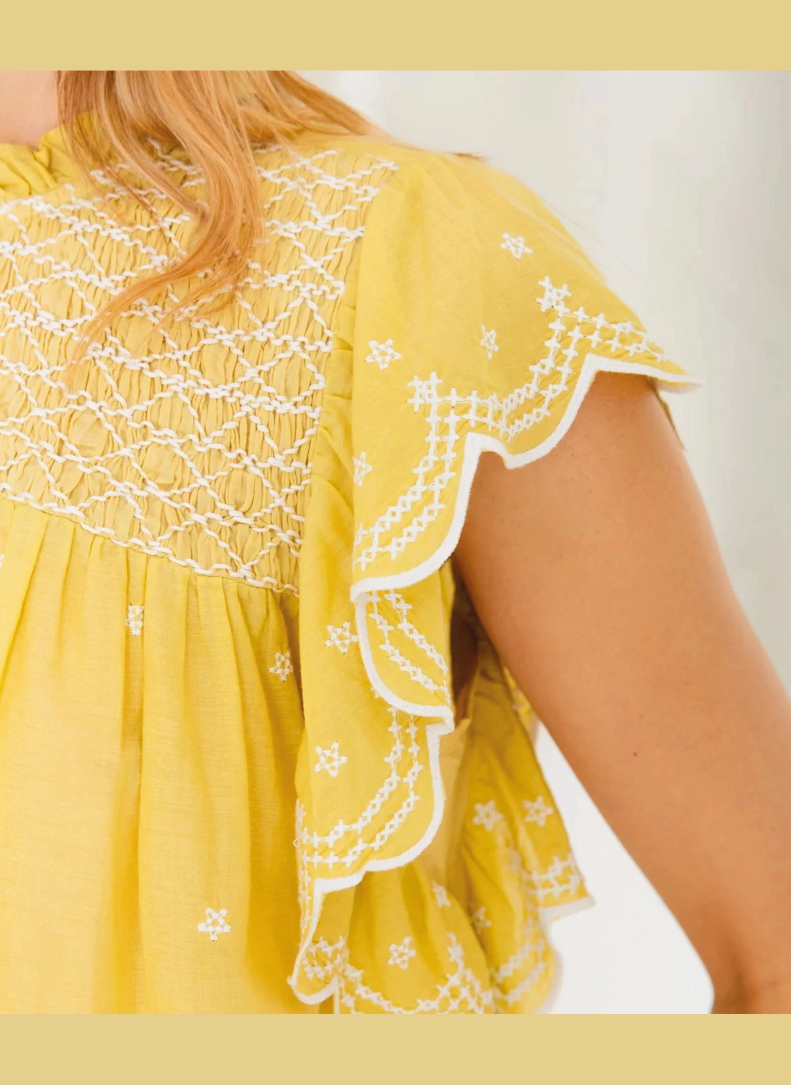 A delicate, feminine + loose fitting hand-smock fronted top with a button back opening is made in a super soft cotton voile + embroidery. The neckline is finished with a small frill. The sleeves have an embroidered boarder detail, which fall + flutter over the shoulder, to form a gentle cap sleeve length. This style is meant to be very easy, loose + floating. The hem is also finished with a boarder embroidery and is best worn hanging over things to show the detail.