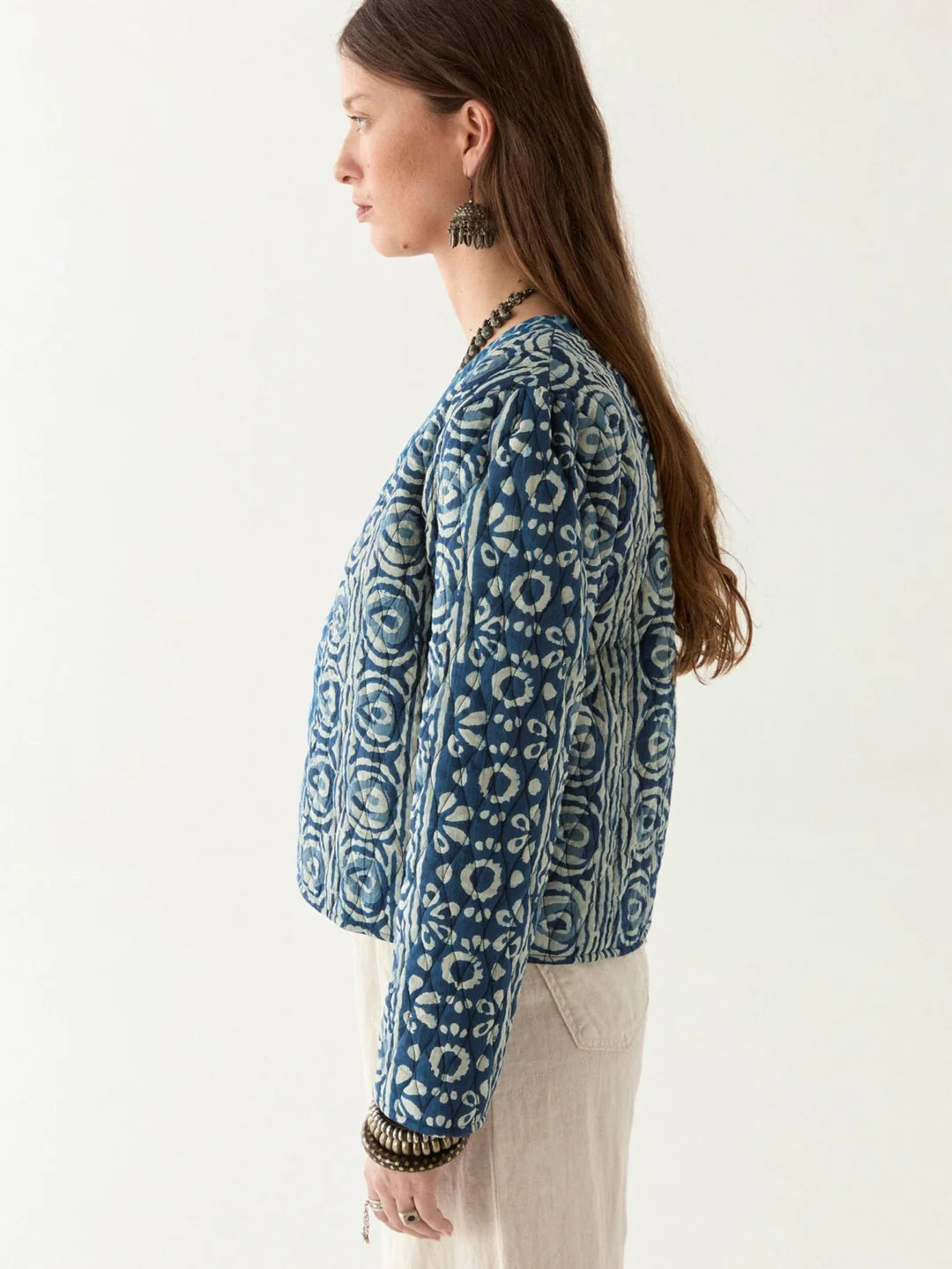 Crafted from quilted cotton, the batik-hued swirl design mimics the motion of waves, ivory patterns breaking through like foam on the surface. Its clean, open-front silhouette is designed for movement, with subtly sculpted sleeves that add just the right amount of volume.