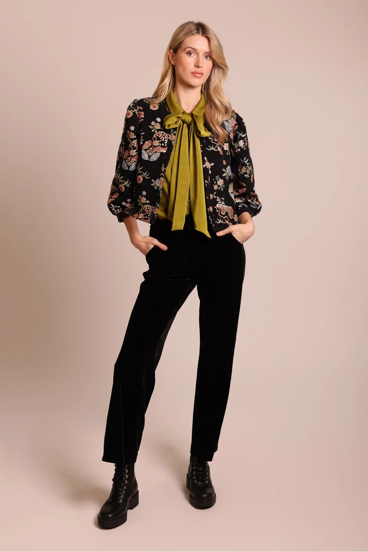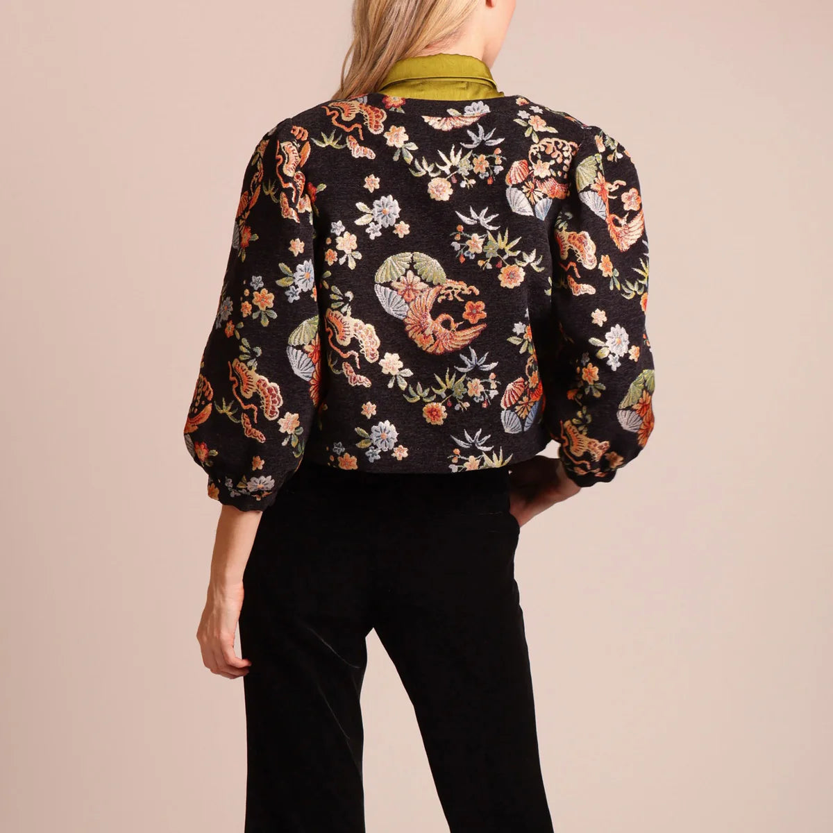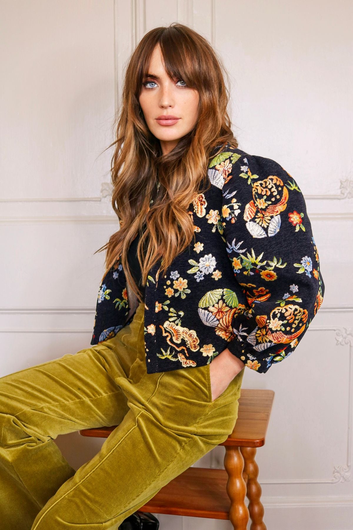 This cropped jacket combines a modern boxy fit with statement puffy sleeves, bringing effortless style to your autumn and winter wardrobe. Finished with delicate floral metallic embroidery, it adds a soft shimmer that catches the light beautifully. With an open front and no fastenings, it's perfect for easy layering and lends a relaxed yet standout feel to any look.
