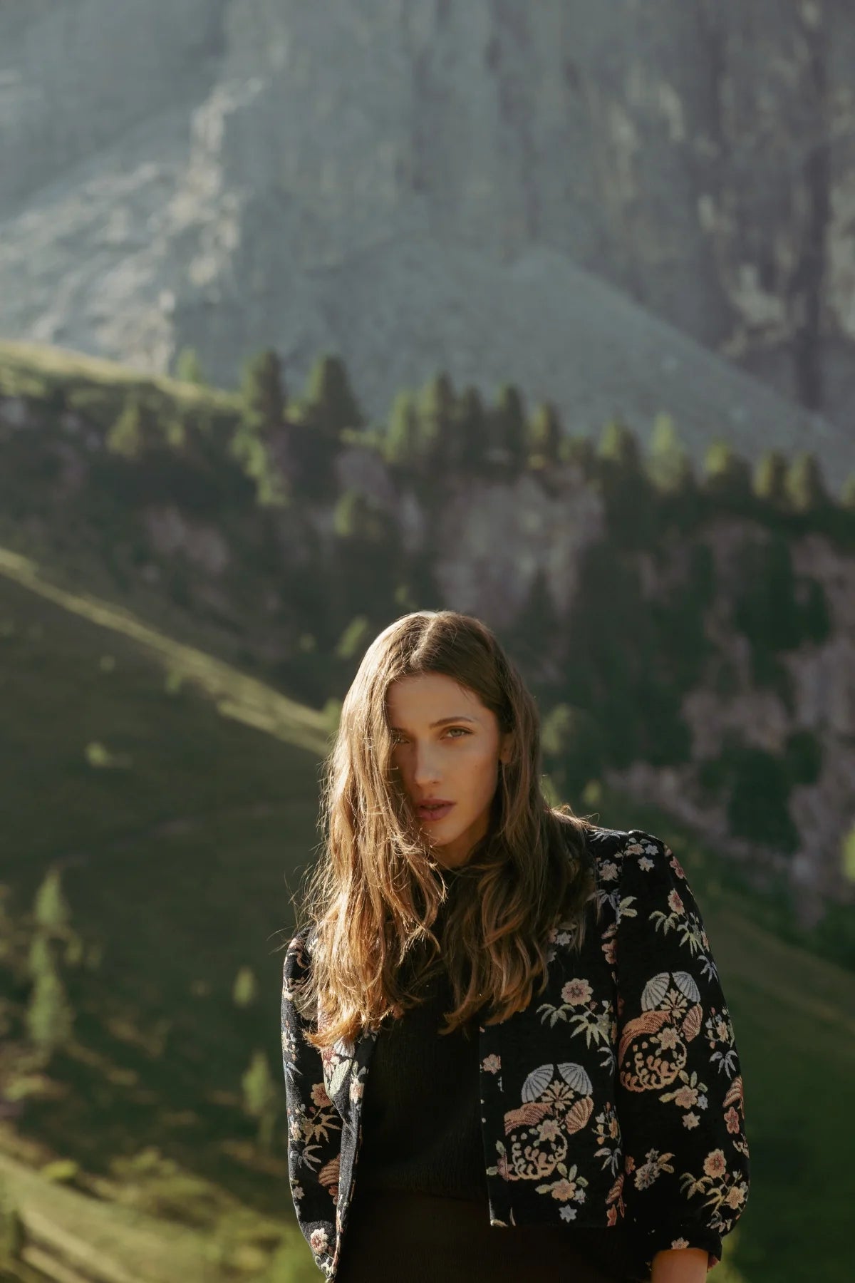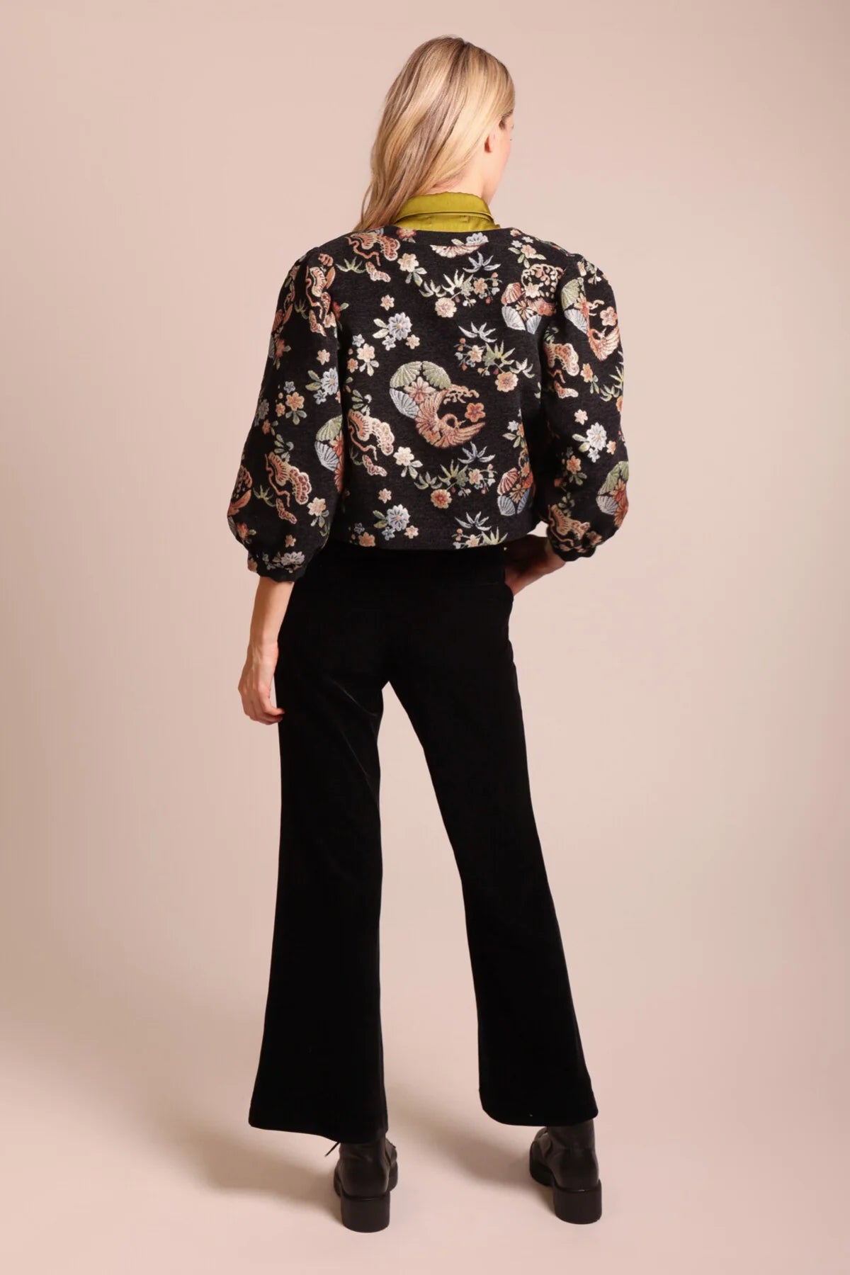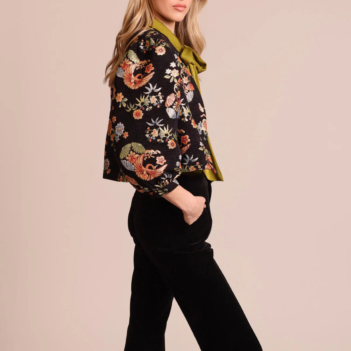 This cropped jacket combines a modern boxy fit with statement puffy sleeves, bringing effortless style to your autumn and winter wardrobe. Finished with delicate floral metallic embroidery, it adds a soft shimmer that catches the light beautifully. With an open front and no fastenings, it's perfect for easy layering and lends a relaxed yet standout feel to any look.