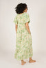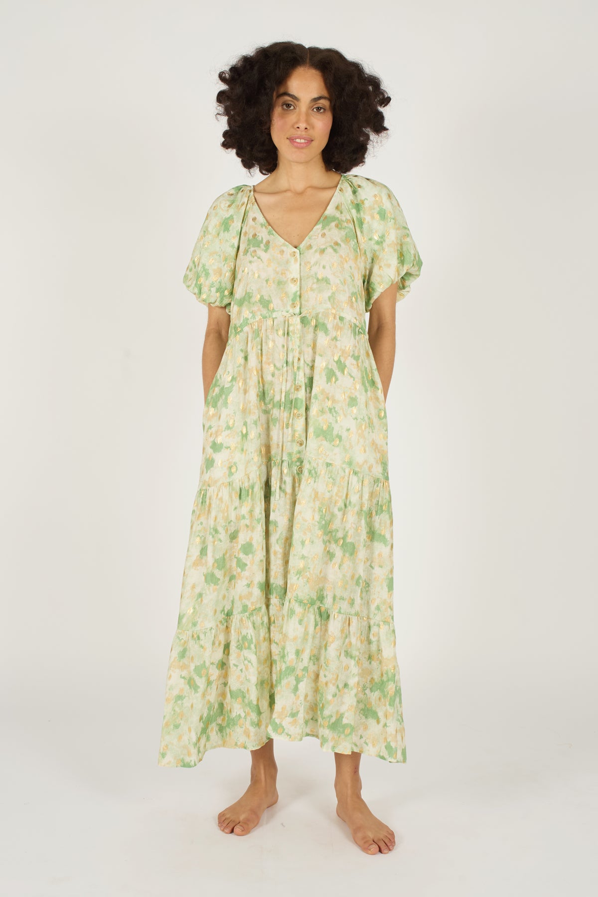 Loose fit midi dress with drawstring waist. Short puff sleeves. Tiered skirt. Full front button fastening.