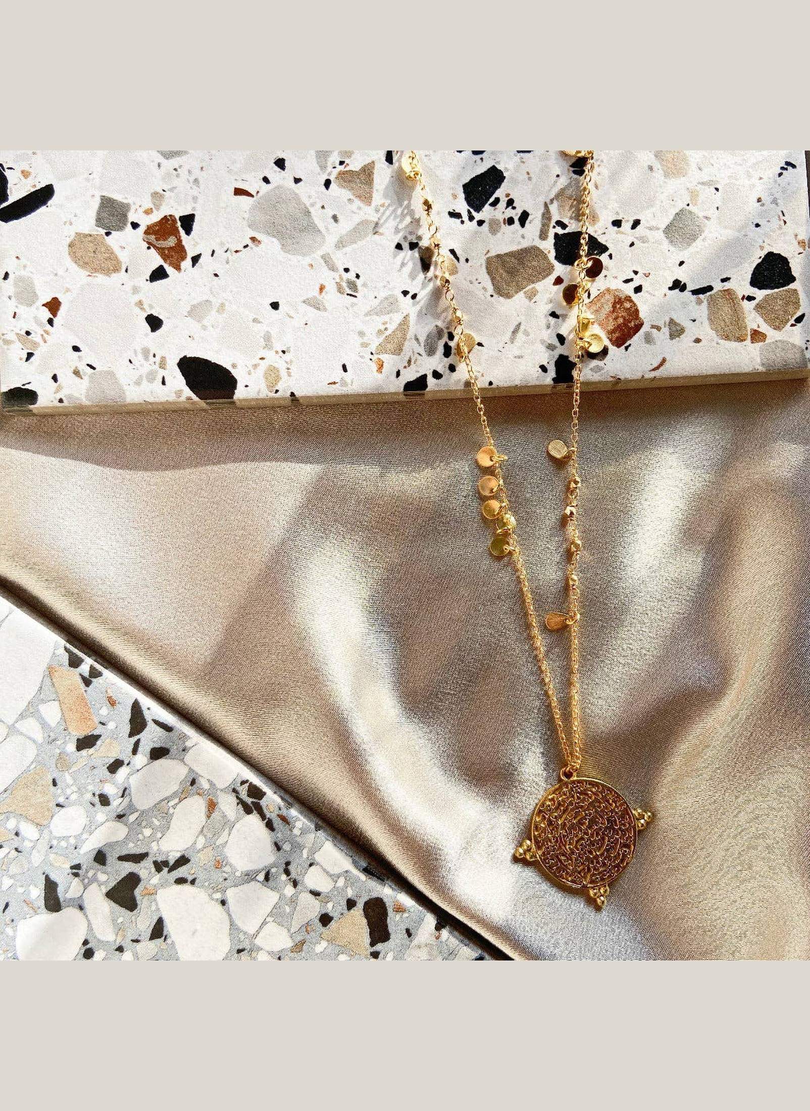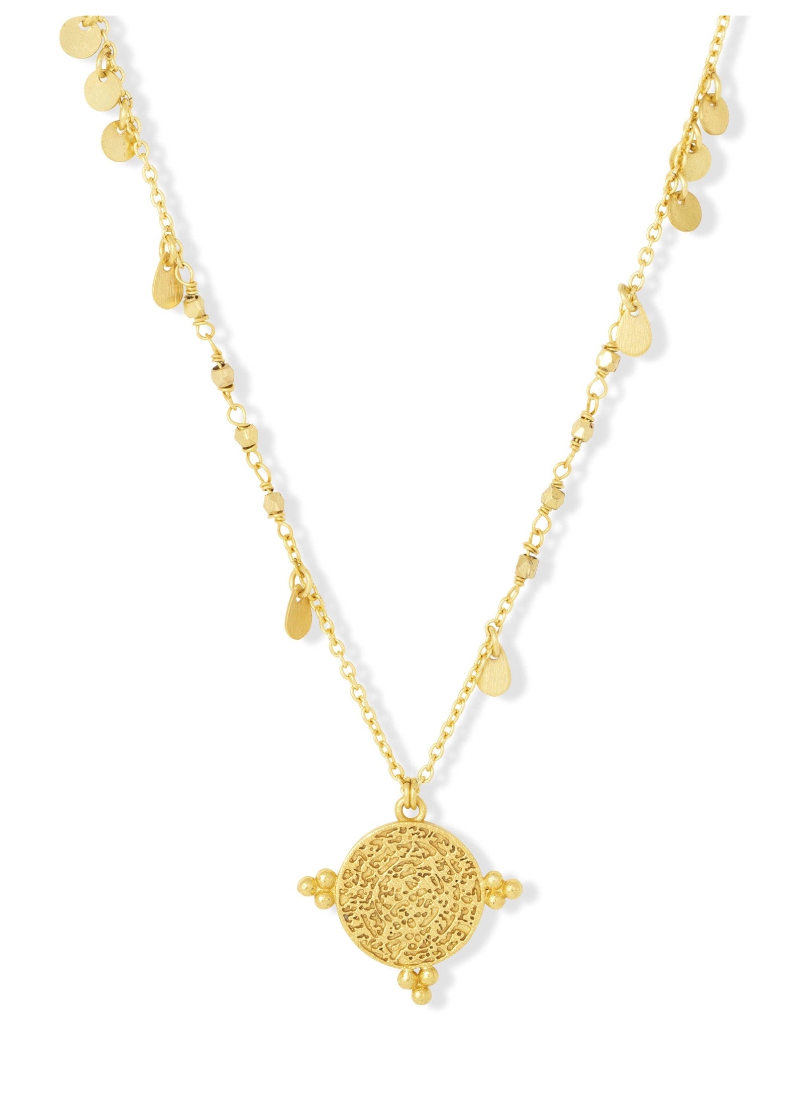Short chain necklace with gold coins and textured gold coin pendant