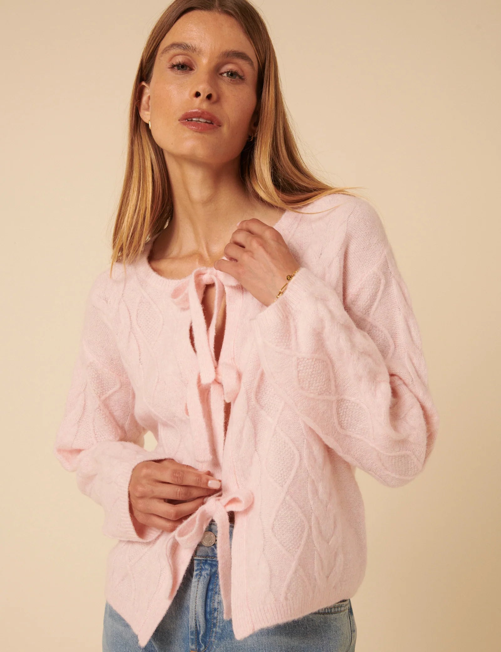 Coming in a soft and chunky cable knit, this warm pink cardigan slips on in a relaxed fit and is fastened with a trio of ties.